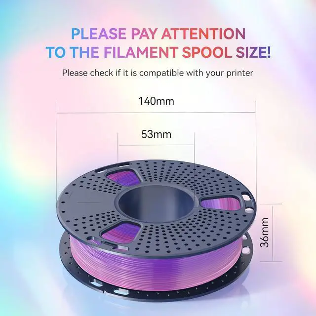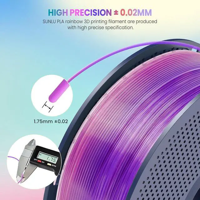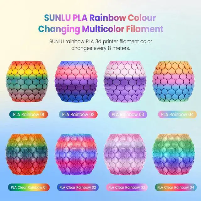 Rainbow PLA Filament: SUNLU Transparent Rainbow PLA filament is reliable, versatile, and easy to use. No clogs, bubbles and tangles, its excellent layer adhesion ensures high-quality prints every time.