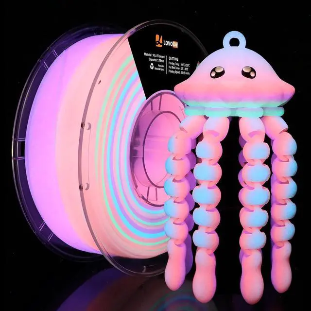 • Luminous RAINBOW FILAMENT: LOVOON GLOW PLA Filament contains 30% luminous powder, Expose your glow filament 3d printing models to the light to charge for 5seconds-30minutes, then it will radiate a soft, ethereal glow in the dark, adding a touch of wonder and enchantment to your 3D printed creations. Note: Charges Faster Under UV Light(Not Included).
