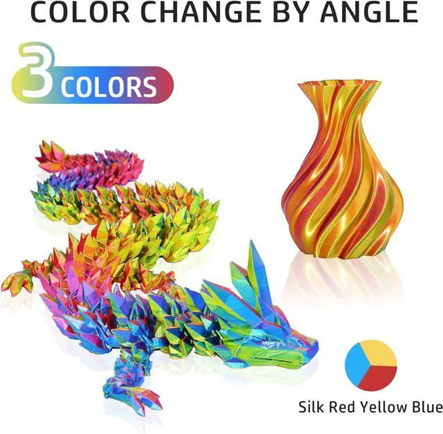 Tricolors PLA Filament: Different from normal color change rainbow PLA filament, this filament is composed of three distinct colors: Red, Blue, Yellow. You will easily get colorful colors, even for very small prints. Different prints will present different effects. Enjoy your 3d printing creations