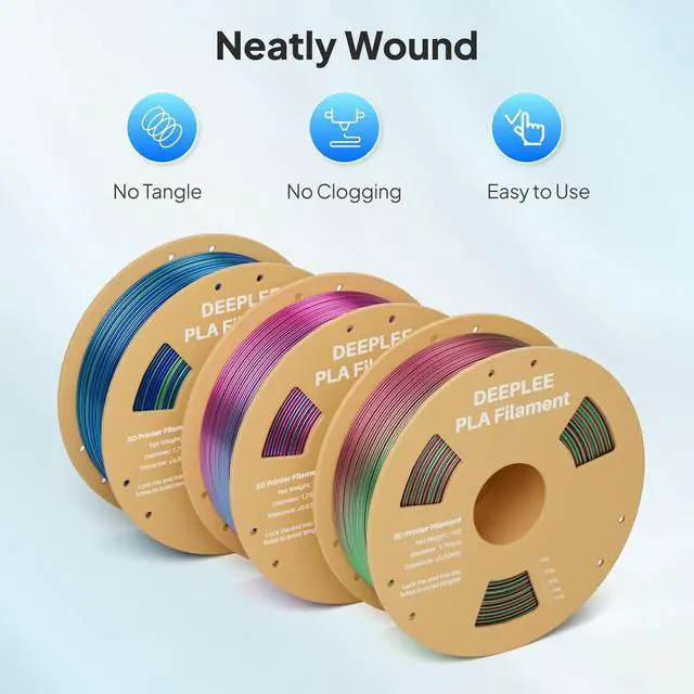 Neatly Wound - Each roll of DEEPLEE Shiny PLA is mechanically wound and undergoes strict manual inspection. The neat arrangement ensures stable and smooth wire feeding. The sturdy cardboard roll design is easy to load and unload