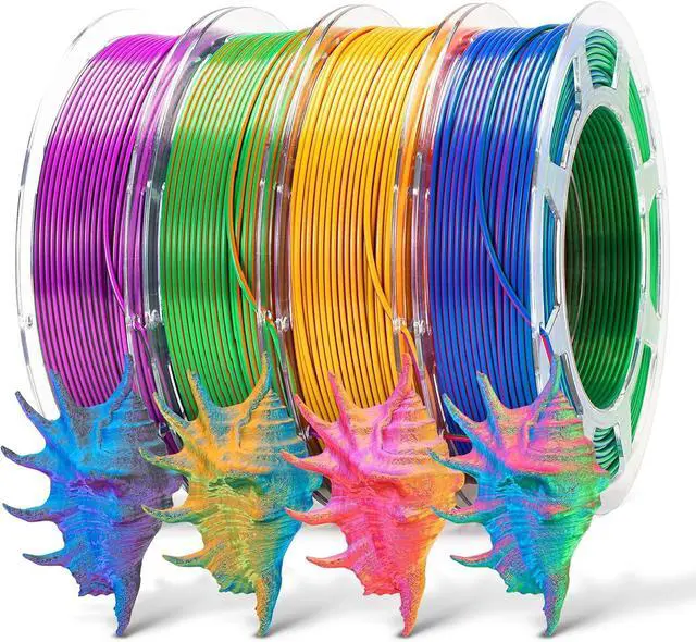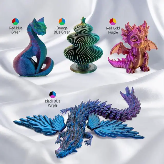 EXQUISITE SILK & MULTI-COLOR EFFECT: This Silk PLA filament bundle features a revolutionary triple color twisting technology. A single spool produces stunning, shimmering multi-color prints with smooth, rapid color transitions, eliminating the need for frequent filament changes. Perfect for bringing vibrant, iridescent life to artistic creations, handicrafts, and DIY projects