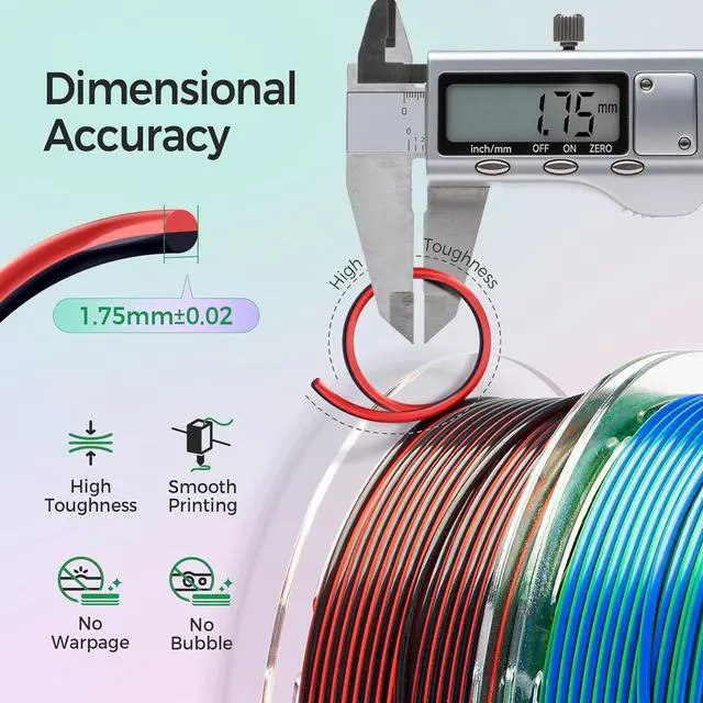 VERSATILE 4-PACK COLOR BUNDLE: This value bundle includes four carefully curated triplel-color sets (Red/Blue/Green, Black/Blue/Purple, Orange/Blue/Green, Red/Gold/Purple). It' s the ideal filament for 3D printer users to build a diverse color library, inspiring endless creativity for models, toys, figurines, and educational prototypes