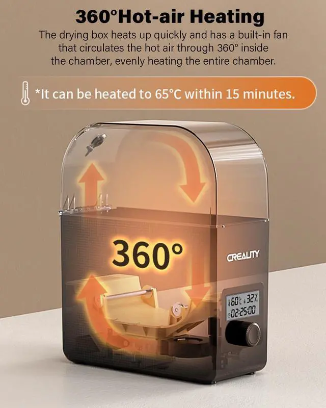 Personalized Temperature Setting- Different drying temperatures can be set according to different 3D filaments; The heating temperature range is 45-65. The drying box has a built-in fan that circulates the hot air through 360° inside the chamber; It can be heated to 65 within 15 minutes