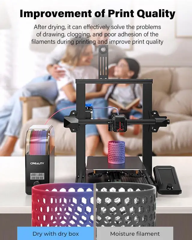 Remove Moisture from Filament- Creality filament dryer box 2.0 can effectively remove moisture from filament while printing; After drying, it can effectively solve the problems of drawing, clogging, and poor adhesion of the filaments during printing and improve print quality