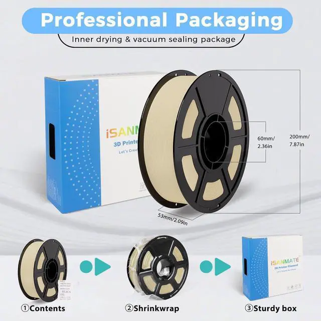 Neatly Wound and Vacuum Sealed packaging 3d printing filament uses full mechanical wire winding to avoid tangles and knots during printing. Complete drying for 24 hours before vacuum packaging to effectively protect the tan filament from moisture, no stringing and bubble-free.