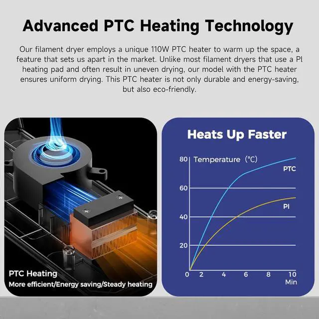 PTC 360° Hot-air Heating & Advanced PTC Heating TechnologyThe Official Creality Space Pi Filament Dryer quickly heats with a built-in fan, circulating hot air 360° for uniform heating, effectively drying moisture filaments and improving printing results. Our Creality Space Pi 3D Printer Filament Dryer employs a unique 110W PTC heater to warm up the space, unlike most filament dryers that use a PI heating pad and often result in uneven drying, our model with the PTC heater ensures uniform drying. This PTC heater is not only durable and energy-saving, but also eco-friendly.