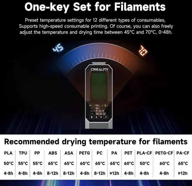 One-key set for 12 filaments & LCD Touch ScreenOfficial Creality Space Pi Filament Dryer has one-key temperature settings for different filament types, supporting up to 12 types of filaments, including common and high-performance composite like PLA, ABS, PETG, TPU, PP, PA, PC, ASA, PET, PLA-CF, PETG-CF, PA-CF. Of course, you can also freely adjust the temperature between 45°C and 70°C. The Creality Space Pi Filament Dryer comes with a 3.7 -inch touch screen for easy operation, making it simple for you to track drying conditions, The touch screen also allows user to easily switch between and.