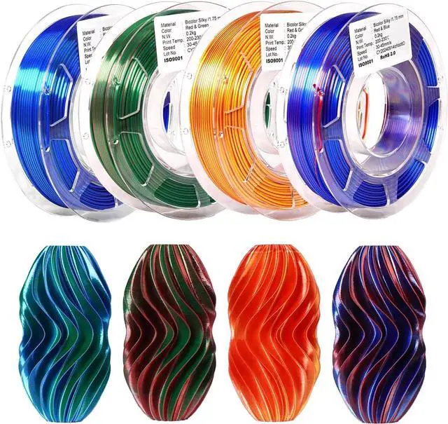 4 Pack Eye-catching Dual-Color Create stunning, high-quality prints with colorful variety 4 Pack dual-color PLA filament. The smooth color transition delivers an eye-catching, glossy finish that adds depth and vibrancy to your projectsno additional post-processing needed