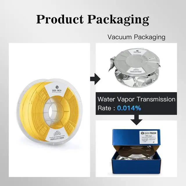 High Compatiblity & Vacuum Aluminum Foil PackQIDI TECH PETG-Tough 3D printing filament is vacuum sealed in a aluminum foil packag to effectively protect the filament from moisture enabling much smoother and more stable printing. Wide compatibility with most 1.75 mm Filament FDM Printers on the market.