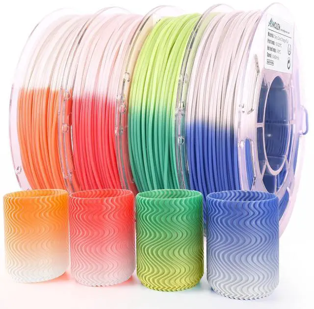 PLA Filament Bundle 4 Colors - Package come with 4 colors 200g/spool 3D Printer PLA filament bundles, color changing filament with green to yellow, blue to white, red to white, orange to white. It' s fun to show the color change with temperature.