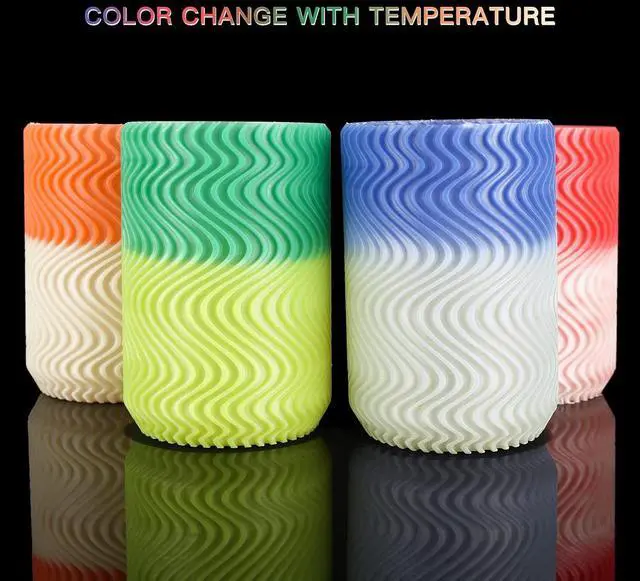 Color Change with TemperatureThe PLA filament looks Green/Blue/Red/Orange under 33or after Refrigerating or put into ice water for 2-3min, above 33green starts getting to yellow, Blue/Red/Orange getting to white. It will return to Green/Blue/Red/Orange at room temperature in 10~15 seconds after getting Yellow/white from warm water, palm of hand, etc.