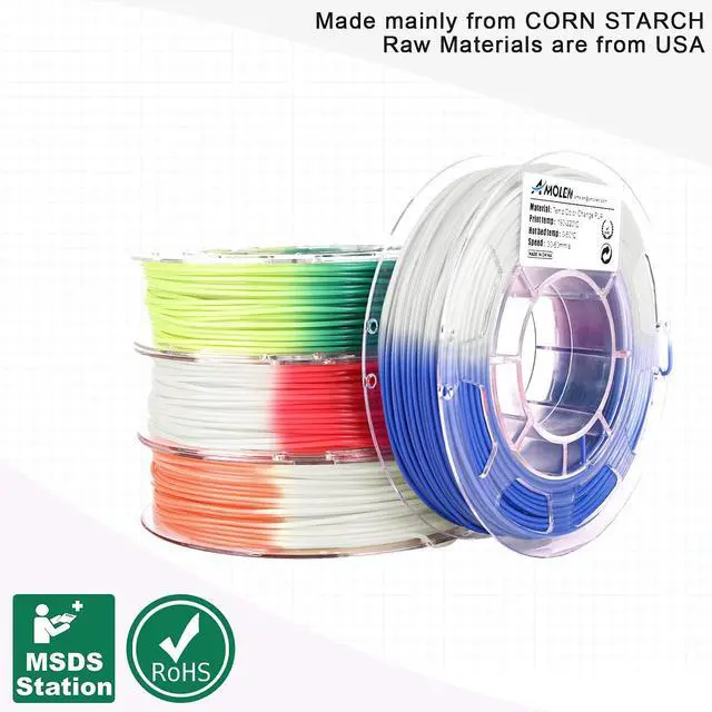 PREMIER MATERIAL & SMOOTHLY PRINT- 3D Printer PLA Filament 1.75 mm Color changing filament Raw materials are from USA, good performance. High quality color change PLA filament good shaping, no bubble, no jamming, no warping, no gloss, more detail and easy to print.