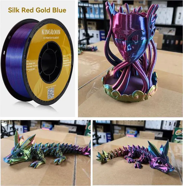 Toughness Enhanced Silk PLA Filaments: Kingroon PLA filaments have the advantages of incredible ease of printing Optimized printing quality, high purity with low shrinkage and superb layer bonding, meeting your demands for printing projects of functional parts with higher toughness.