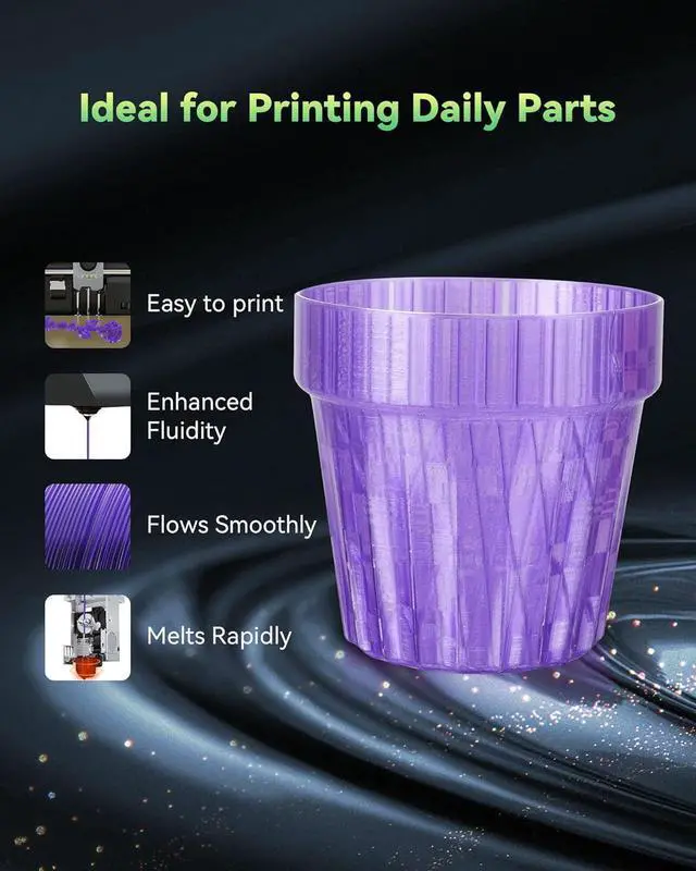 Premium HS PETG: Durable&flexible with high impact resistance. Minimal stringing, strong layer adhesion, no bubbles/cracking. Odorless, easy to print, smooth surface finish. Ideal for functional daily parts