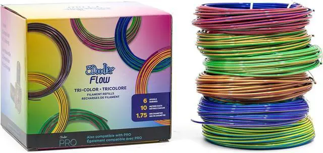 Tri-Color Filament Refills Unleash your creativity with 3Doodlers Tri-Color PLA filament refills. Each pack includes 6 spools, offering a total of 60 meters of vibrant filament. Designed for 3D printing pens, these refills provide smooth, consistent extrusion, perfect for intricate designs and detailed projects.