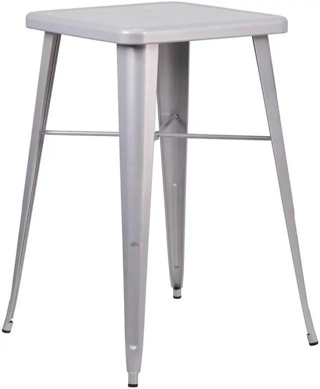 With its simple lines and bright color, this indoor-outdoor metal bar height table is sized right for small spaces. Compact in design, the table top is 23.75 inches square and has a 2 inch lip with rounded corners. The legs extend to 27.75 inches in width at the base. The table features a cross-brace that provides increased support and stability. Rubber floor glides protect your floor by sliding smoothly when you need to move the table. Galvanized steel construction and a powder coat finish ensure durability and easy maintenance. Designed for both commercial and residential use, this trend-setting table is a great choice for your home or the bar area in your restaurant.