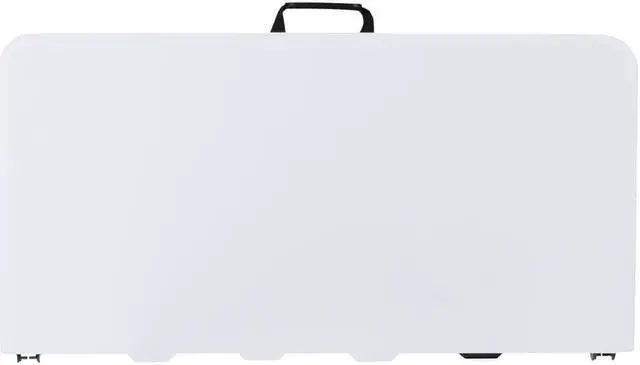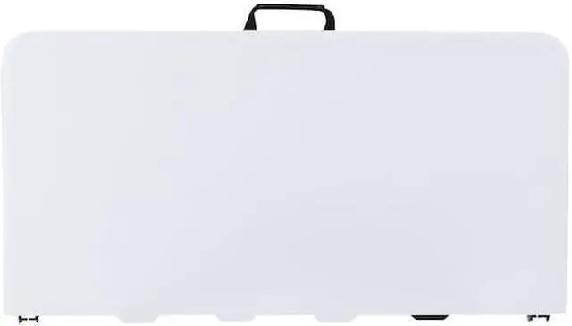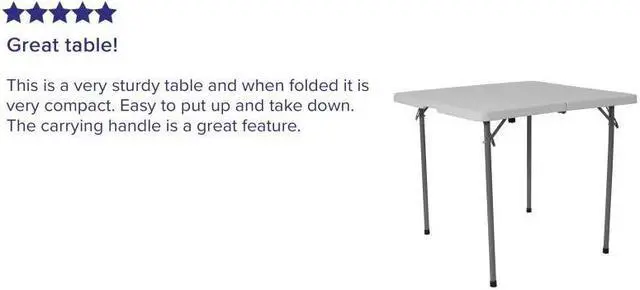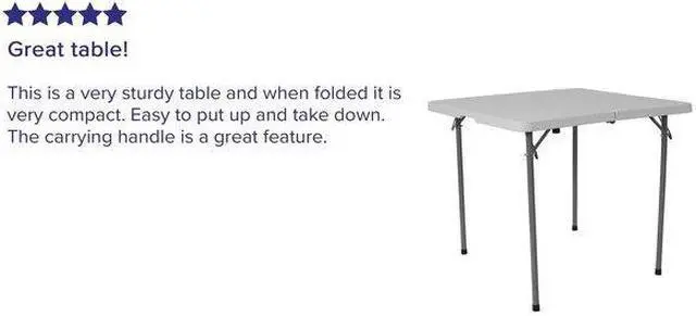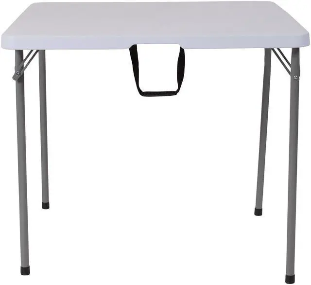 It's game time when you pull this folding table out that folds in half and includes a carrying handle to take with you anywhere. This square plastic folding table is the perfect game table to seat 4 people for card and board games. This compact table can serve multiple uses in the hospitality industry, business offices and in the home to seat extra people or hold plates, napkins and cups during gatherings. Dine outdoors on the deck to enjoy the summer breeze, this table sets up in no time. This mini table travels well for people who live on the road in vans, campers and RVs.