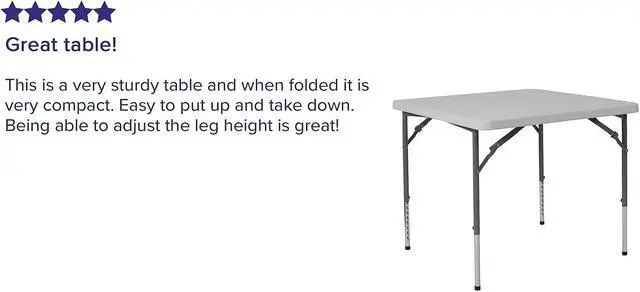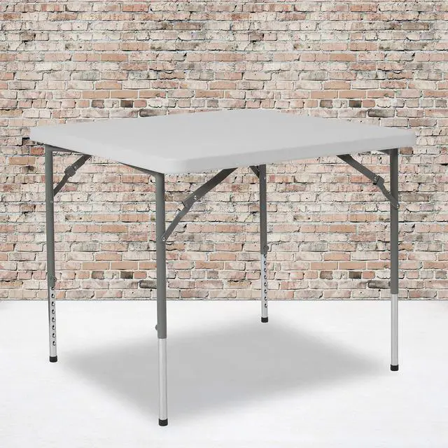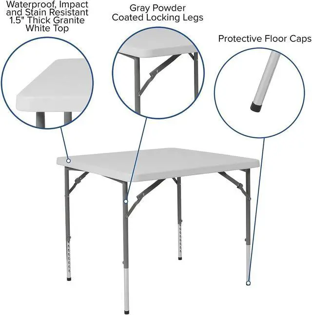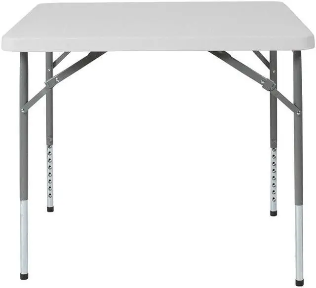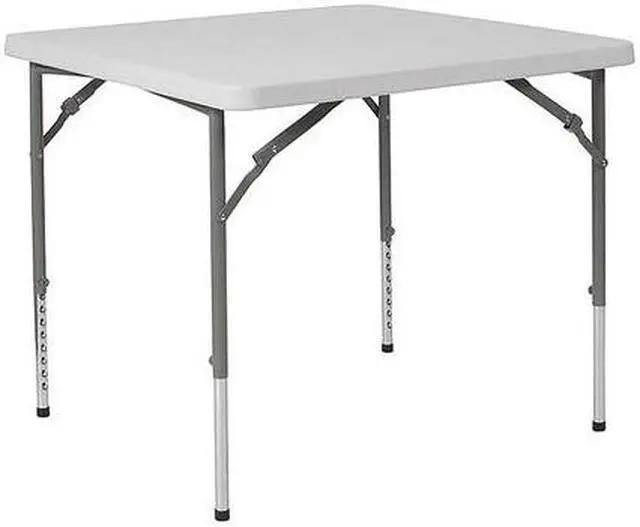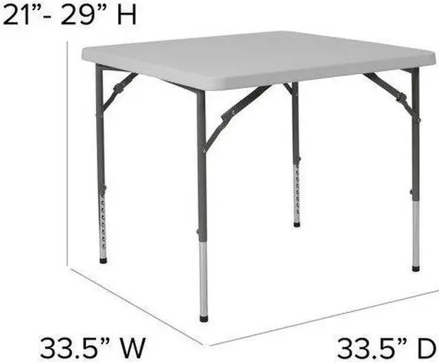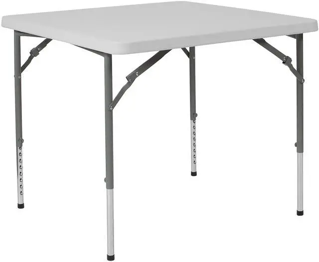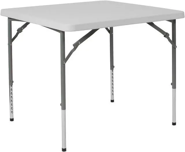 It's game time when you pull this adjustable folding table out. This square plastic folding table is the perfect game table to seat 4 people for card and board games. This compact table can serve multiple uses in the hospitality industry, business offices and in the home to seat extra people or hold plates, napkins and cups during gatherings. Dine outdoors on the deck to enjoy the summer breeze, this table sets up in no time and can be adjusted to various seat heights. This mini table travels well for people who live on the road in vans, campers and RVs.