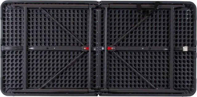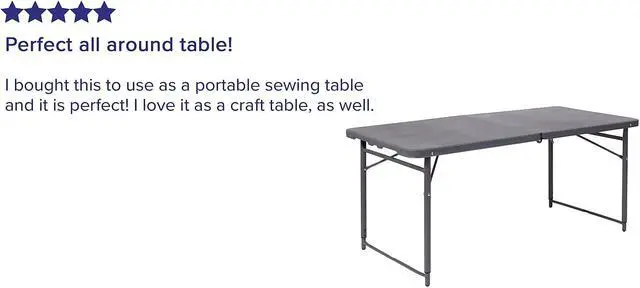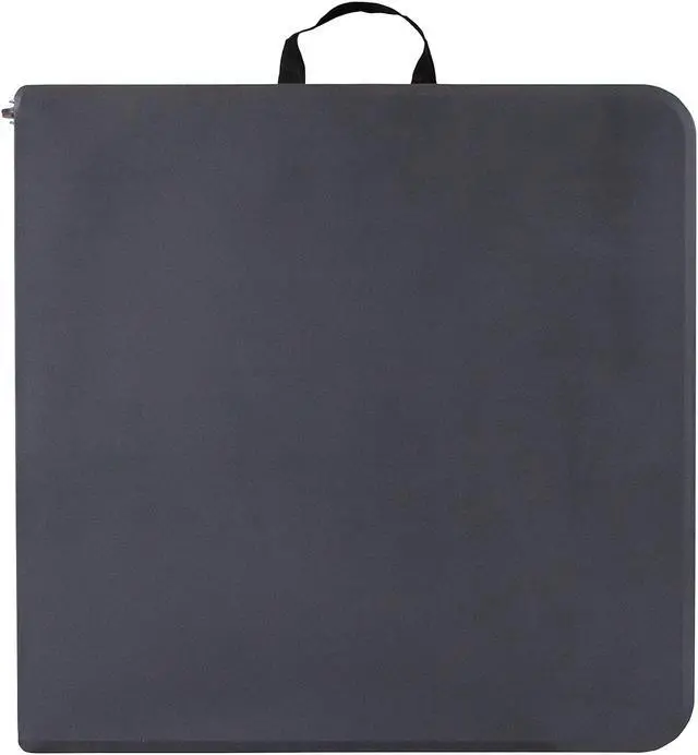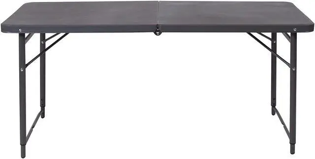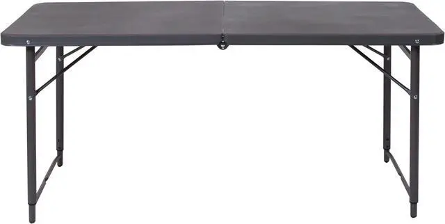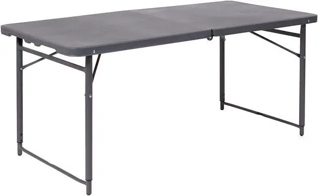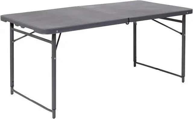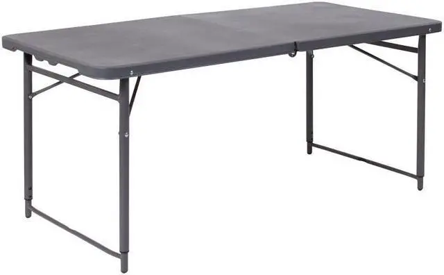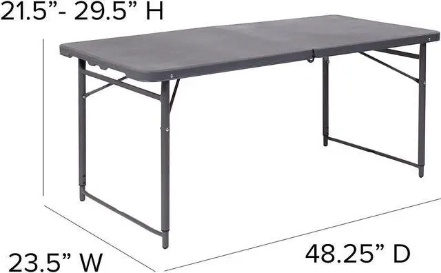 Go ahead and invite everyone to your next gathering without the worry of where they will sit. This adjustable height bi-fold plastic folding table is a great option when you need a temporary dining surface or an everyday workstation in your home or office. This versatile folding table can be dressed up or used as is with its dark colored top during holiday events, parties and arts and craft activities. Adjust the table's height to accommodate different users. Place multiple tables side by side or in rows to accommodate large party events. The waterproof, impact and stain resistant top have a 220 pound static load capacity and is commercial rated for use as a training table, in banquet halls and at trade shows. The thick, dark gray tabletop is 4' long, 1.25" thick, and will seat up to 4 adults. Attractive gray powder coated legs lock securely in place while in use and non-marring floor caps protect your floor by sliding smoothly when you need to move the table. This durable, easy to clean table folds in half, making it easy to store and transport, using the convenient carrying handle attached on the side. The 23.5"W x 48.25"L Height Adjustable Bi-Fold Dark Gray Plastic Folding Table with Carrying Handle is perfect for in-home events or on the deck or patio while entertaining during a barbeque. Designed for both indoor and outdoor use, store table indoors and protect the frame from extreme moisture. Rectangular folding tables offer the best solution for your home or business.Product Dimension-23.5"W x 48.25"D x 21.5" - 29.5"H