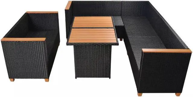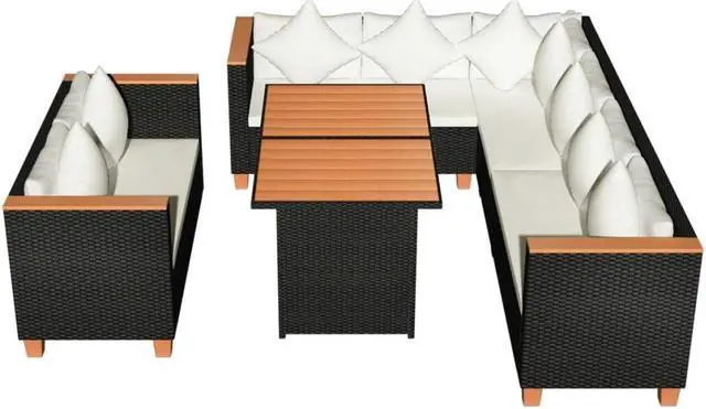 The cushion covers are removable and washable. The sturdy tabletop and armrest tops are made of durable WPC. Delivery includes two 2-seater sofa segments (each with one armrest), one 2-seater sofa, one corner sofa segment, one table, nine pillows, nine back cushions, and four seat cushions.