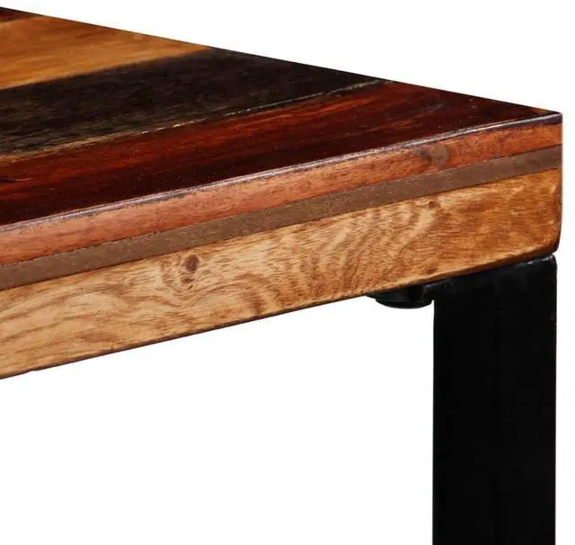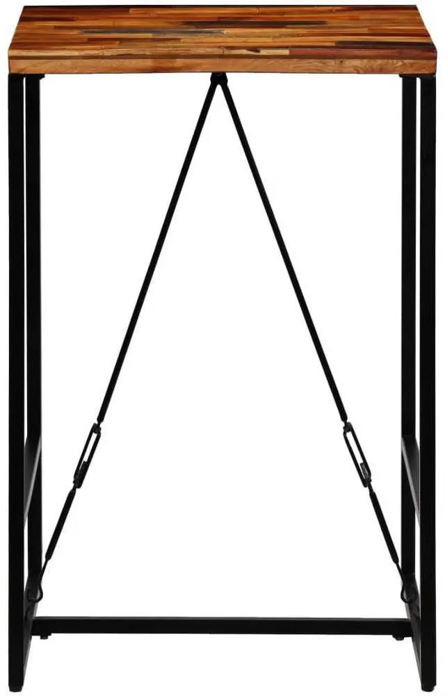 The bar table has a stable and durable tabletop that is made of solid reclaimed wood. The reclaimed wood was sourced from joists, floors and support beams from old buildings being demolished, and can consist of different types of wood like pine, teak, beech, oak, cedar, mango wood, acacia, etc.