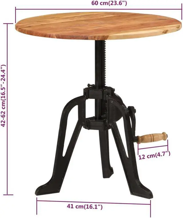• Material: Solid acacia wood, cast ironDimensions: 23.6" x (16.5"-24.4") (Diameter x H)Assembly required: Yes EAN:8720286672105 SKU:338453 Brand:vidaXL