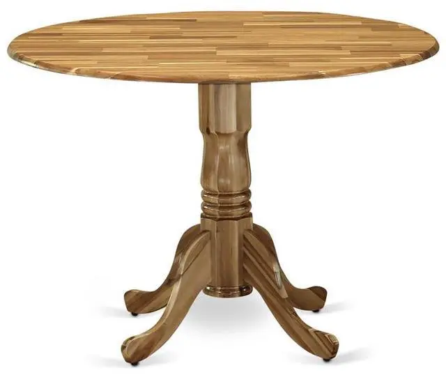Enrich the elegance of your dining area with this DLT-ANA-TP Dublin dining table that features a Wood Texture table top and a pedestal. This Round shape wooden table with two 9-Inch Drop Leaves can be placed anywhere in the kitchen area and would be a great choice if you are struggling with space in your dining room. With a soft rounded bevel at the edge of the table top, this well-designed and comfortable kitchen table may be used for hours at a time. Made up of Acacia Wood, the dinette table is stable and offers a sturdy finish.