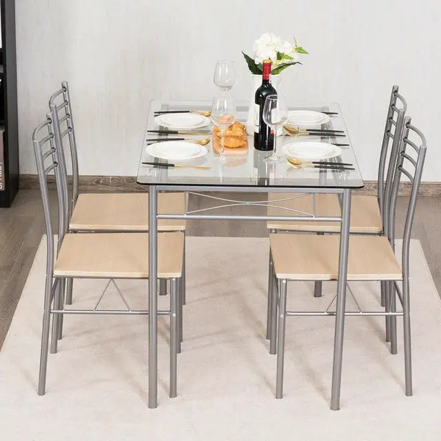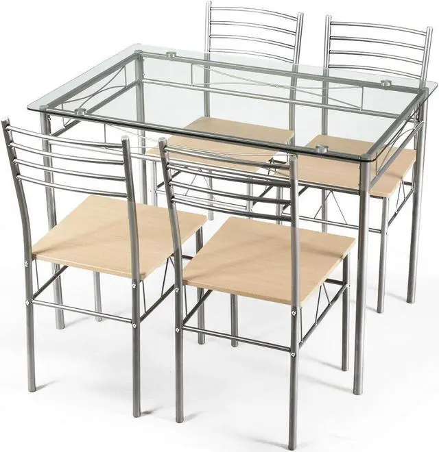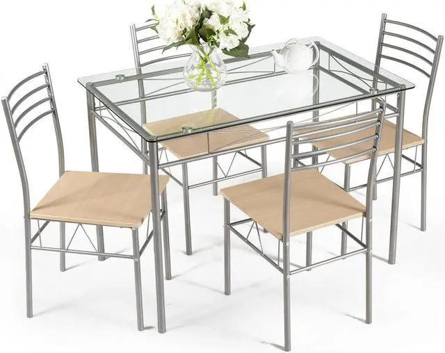 Elegant Design: Glass tabletop with a shelf below the top. Four MDF chair top materials connect with sliver iron pipe. It makes your room looks more modern and fashionable.