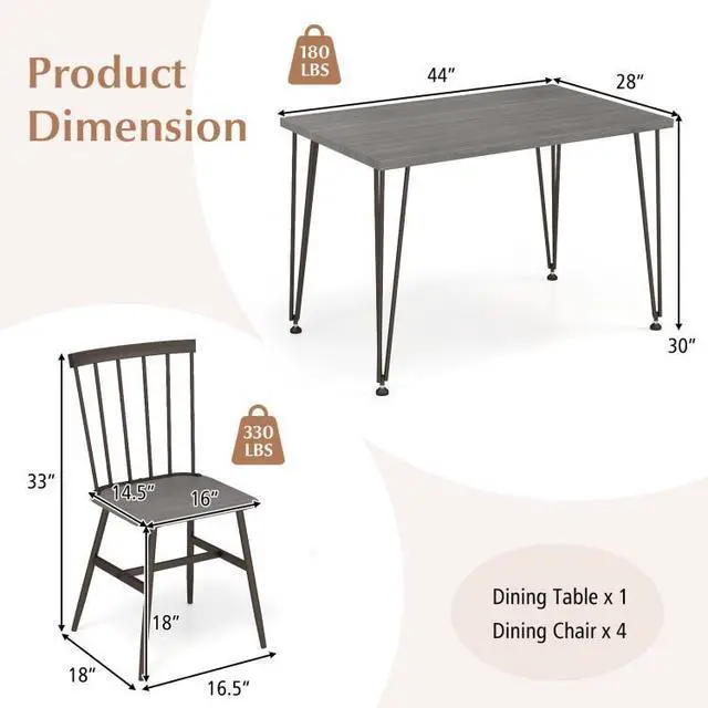 5-Piece Furniture Set: This dining room furniture set for 4 includes a kitchen table and 4 dining chairs, providing ample seating for family meals and entertaining friends. The table measures 44" x 28" x 30" (L x W x H), and the chair measures 16.5" x 18" x 33" (L x W x H).