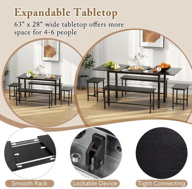 Extendable Table for Any Occasion: Equipped with a smooth track system that ensures effortless folding and unfolding, the rectangular table can accommodate 4-6 people, making it perfect for family meal or large gathering. The secure lock and lockable sides cam prevent any unwanted movements or instability during use.