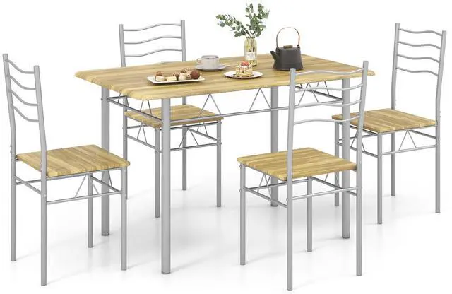 Elegant Appearance and Selected Material: Equipped with a rectangle-shaped table and 4 chairs with iron pipe backrests, this shallow walnut table set is the perfect addition to your decoration. It brings a brand-new feeling of compact structure, smooth design, and moderate texture. The carved design on the chair top and desk gives a special charm to this set.