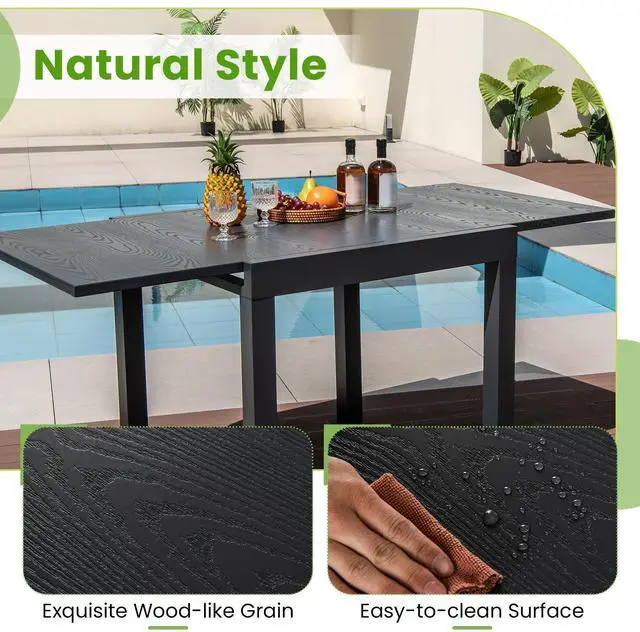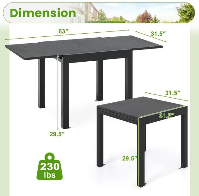 Durable Aluminum Construction: This extendable dining table is forged from premium aluminum that is resistant to rust, wear, and enhances the weight capacity up to 230 lbs/105 kg. Besides, its powder-coated surface is born for the long outdoor use.