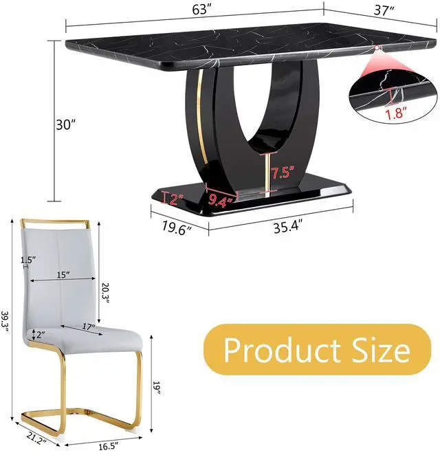 Sumdeal 63"Modern Black Rectangle Faux Marble Dining Table Room Sets for 6,Dining Table with 6 PU Leather Dining Chairs,Black Table and 6 Light Gray C-shaped Chairs with Golden Leg