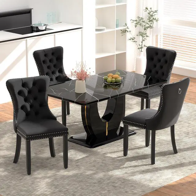 entertaining guests, or working from home. The table features a sleek black imitation marble finish, a sturdy medium-density fiberboard (MDF) top, and luxurious velvet-upholstered seats framed by a solid wood frame and classic nailhead accents. The