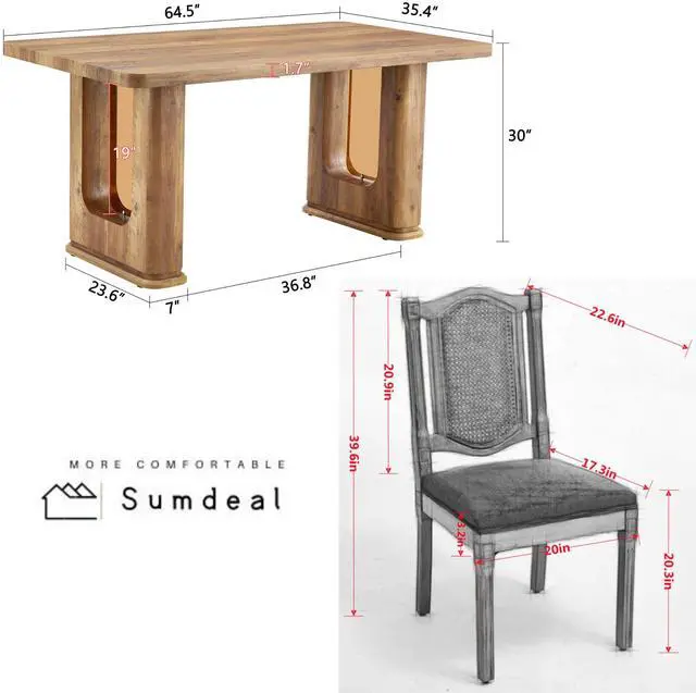 perfect choice for family meals, holiday celebrations, and morning coffee breaks for years to come.The set includes:1 dining table (64.5 inches long x 35.4 inches wide x 30 inches high)4/6 dining chairs (20.9 inches long x 19.7 inches wide x 38.8