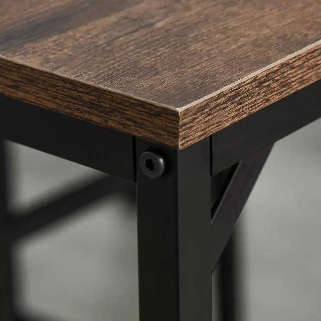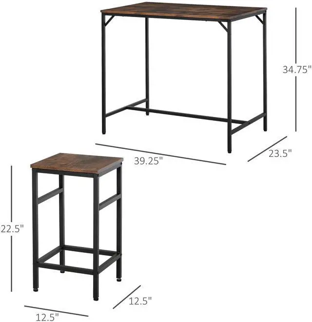 SEATS UP TO 4: This functional set includes a rectangular bar table and 4 matching stools. It's perfect for creating a cozy dining and relax with your family and friends. INDUSTRIAL STYLE: Two-tone construction of rustic wood and dark steel makes a distinct statement in a modern setting. Seamlessly accent your kitchen or other bar area. SPACING SAVING: Armless stools offer free movement for an unrestricted seating experience, and can be neatly located under the desk to save space when not in use EASY TO CLEAN: Melamine laminated particleboard ensures easy cleaning, while the steel frame adds to its sturdiness. The side bracket and crossbar strengthen the stability. Adjustable protective levers keep this 5 piece bar table set standing upright without wobbling and protects the floor from scratches. KITCHEN TABLE SET INFORMATION: 39.25" L x 23.5" W x 34.75" H (table), 12.5" L x 12.5" W x 22.5" H (stool). Weight Capacity: 44lbs (table), 220lbs (stool)