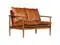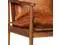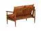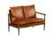 The sofa is made of solid acacia wood that has been given a honey finish by polishing, painting and lacquering to provide a refined look. It is entirely handmade, and the beautiful wood grains make every piece of furniture unique and slightly different from the next. This sofa is upholstered with soft goat leather and padded with thick foam for excellent seating experience.