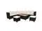 The cushion covers are removable and washable. The sturdy tabletop and armrest tops are made of durable WPC. Delivery includes two 2-seater sofa segments (each with one armrest), one single sofa segment without armrests, one corner sofa segment, one coffee table, two ottomans, eight pillows, eight back cushions, and six seat cushions.