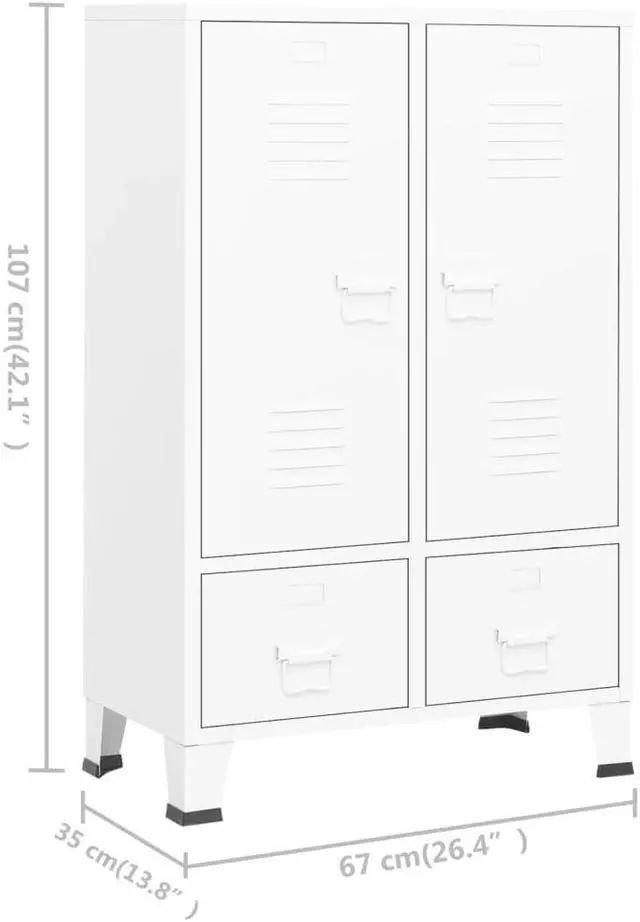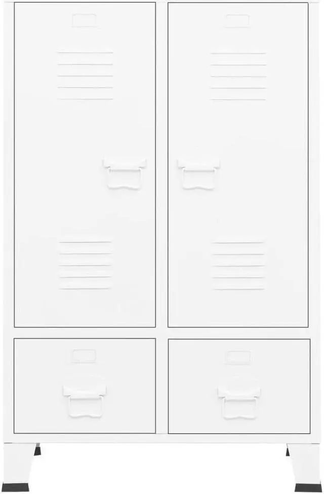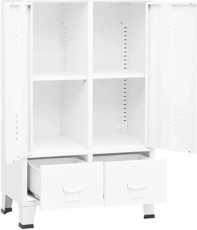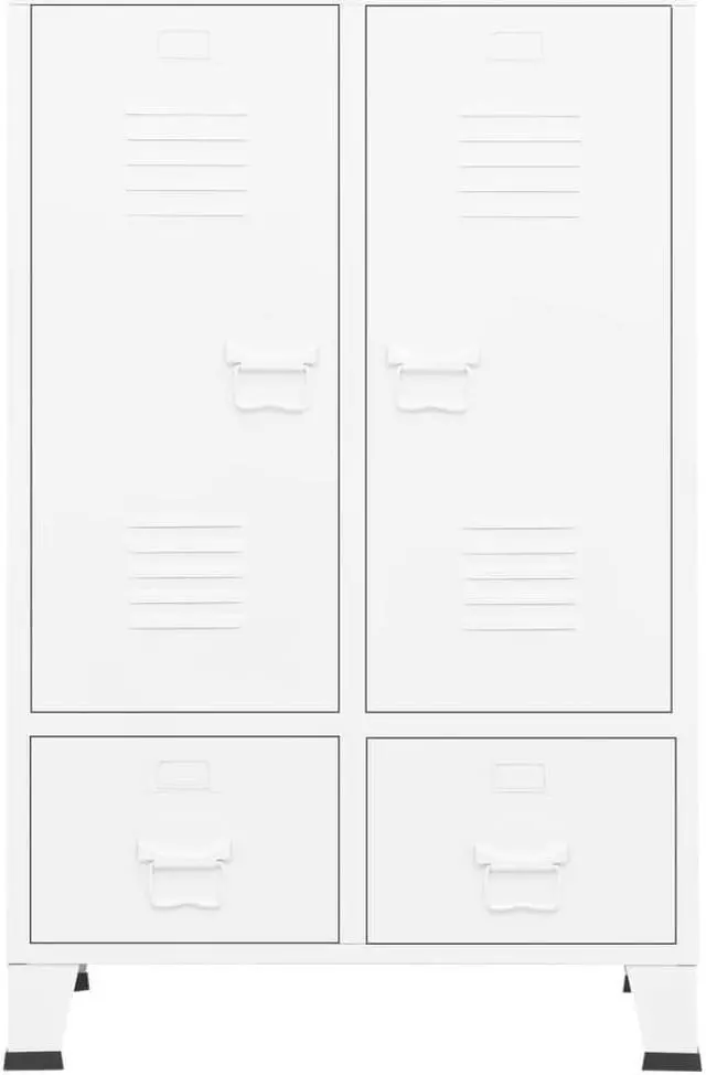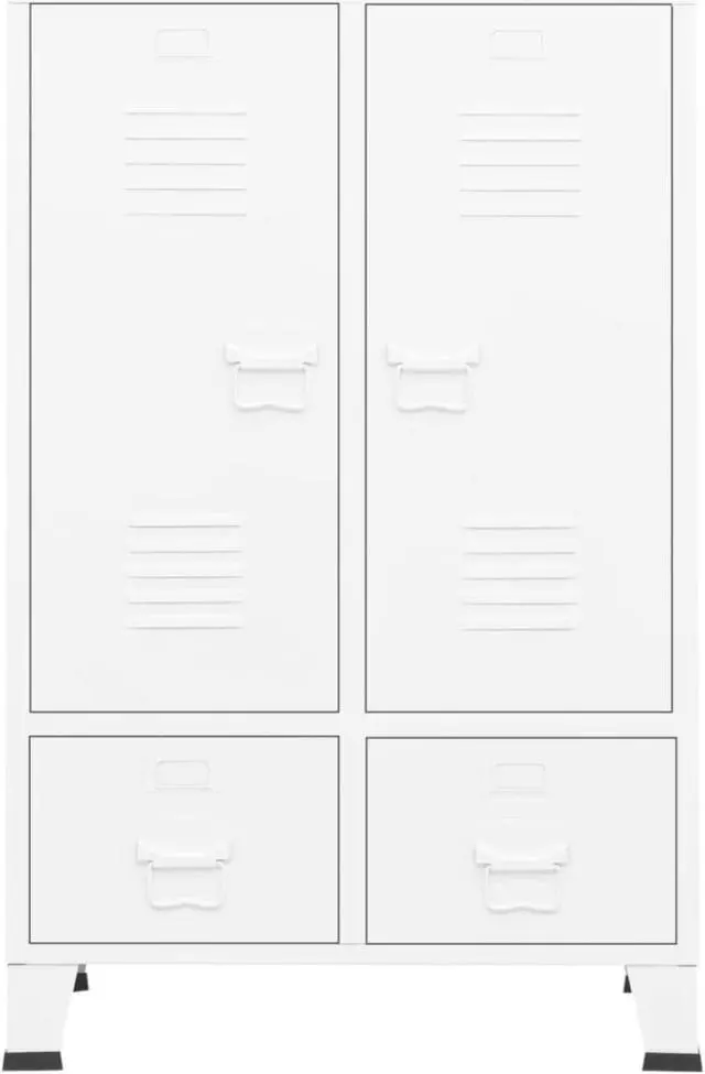 The storage cabinet is made of steel, making it durable and easy to clean. This closet has 2 adjustable shelves that allow you to neatly sort your clothes into different categories and 2 drawers for storing and organizing your socks, underclothes, etc. The drawers with 2 sections ballbearing runners ensure smooth opening and closing, even under increased load (drawers can be fully extended). Each door has a name card holder and ventilation holes to add to its industrial look.