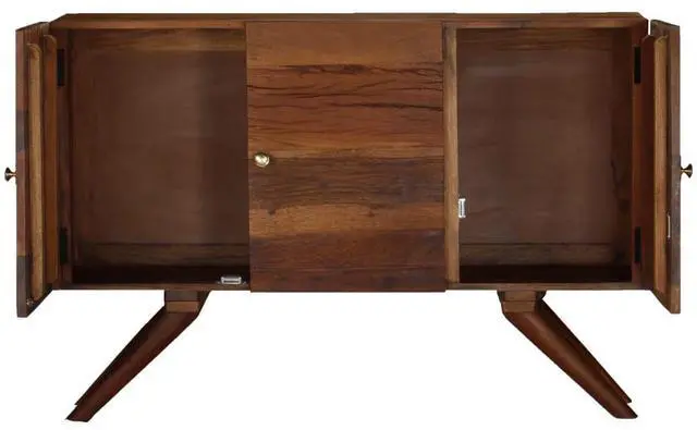 The beautiful wood grains make every piece of furniture unique and slightly different from the next. Signs of wear and visible grain structure are indicative of the wood's rich history and give the cabinet a warm and authentic look. Every step of the process is carried out with the greatest care, be it polishing, painting or lacquering. Designed with ample storage space, the sideboard keeps your magazines, books, DVDs and multimedia devices well organized and within reach. It is