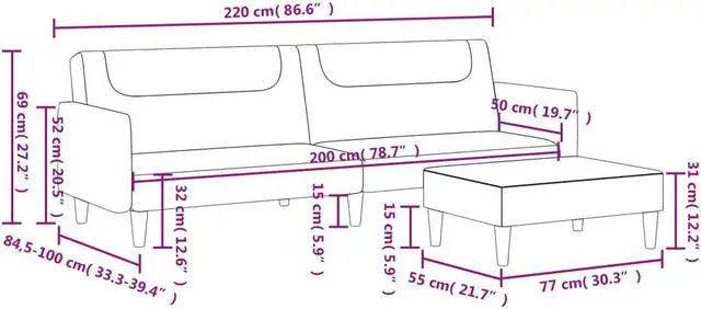 Overall dimensions: 86.6" x 39.4" x 20.5" (L x W x H)