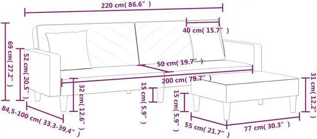 Overall dimensions: 86.6" x 39.4" x 20.5" (L x W x H)