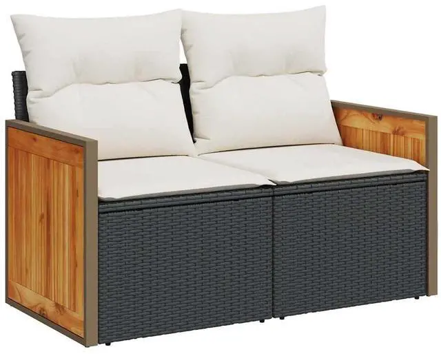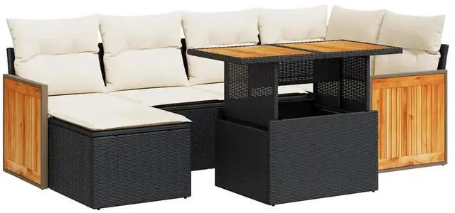 This 7 Piece Garden Sofa Set mixes modern design with practicality, giving you a stylish way to lounge outdoors and socialize. With a sleek black and cream look, this set is made from strong poly rattan and solid acacia wood, perfect for making your patio, balcony, or backyard inviting.