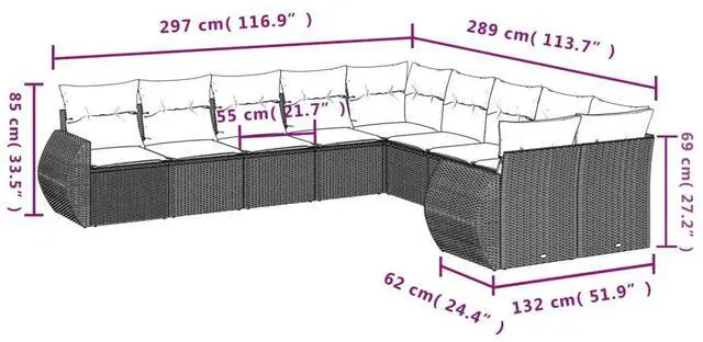 Delivery Contains: 2 x Corner seat, 6 x Center seat, 2 x Arm sofa, 12 x Back cushion, 10 x Seat cushion with removable and washable cover