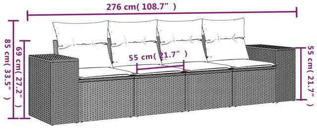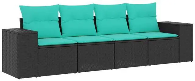 This 4-Piece Garden Sofa Set gives a stylish way to enjoy outdoor seating. Its modern design and practical features are perfect for balconies, gardens, and patios. Made from tough synthetic poly rattan and comfy cushions, this set invites relaxation and looks great in nature with its inviting colors and woven texture.