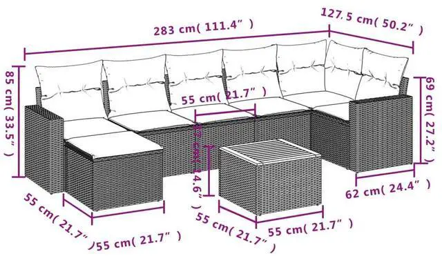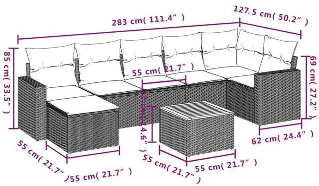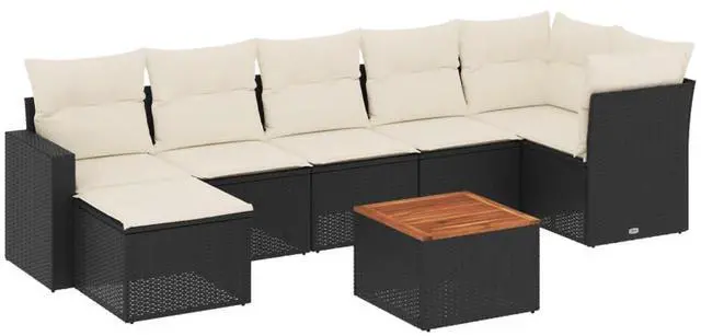 This 8 Piece Modular Garden Sofa Set brings a stylish and welcoming vibe to your outdoor area. Ideal for balconies, patios, or living rooms, it combines modern design with practical use, providing a comfy lounging spot for gatherings or relaxation. The slick poly rattan build gives it a trendy edge, while the soft cushions add a crucial touch of comfort, making it perfect for chilling outside or entertaining guests when the weather's nice.