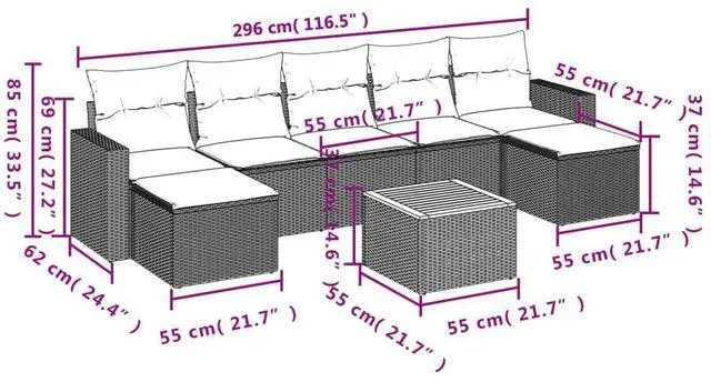 Delivery Contains: 3 x Center seat, 2 x Arm sofa, 2 x Footstool, 1 x Table, 5 x Back cushion, 7 x Seat cushion