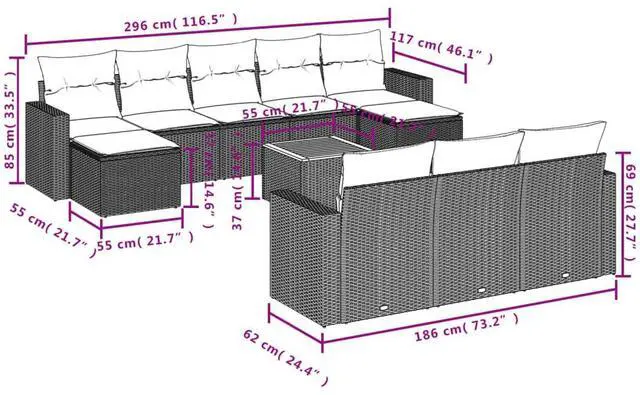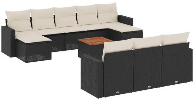This 11-piece garden sofa set perfectly mixes style and practicality, making it just right for sprucing up your outdoor space or balcony. With its modern look in black poly rattan and cushioned seating, it creates a welcoming vibe for fun hangouts or a relaxing night under the stars.