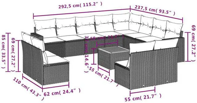 Delivery Contains: 1 x Corner seat, 9 x Center seat, 2 x Arm sofa, 1 x Garden table, 13 x Back cushion, 12 x Seat cushion