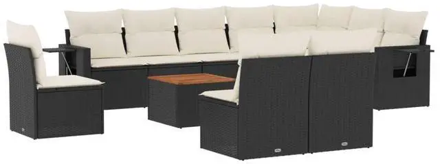 This 11 Piece Modular Outdoor Sofa Set, designed for those who appreciate style and comfort, easily transforms your outdoor spaces into inviting areas for relaxation and socializing. Made from premium materials like UV-resistant poly rattan and solid acacia wood, this set features a sleek black finish, paired with plush cream cushion covers that enhance its elegant look. Perfect for patios, gardens, or balconies, the flexible design lets you host gatherings or just chill in style, making it a top choice for families and friends.